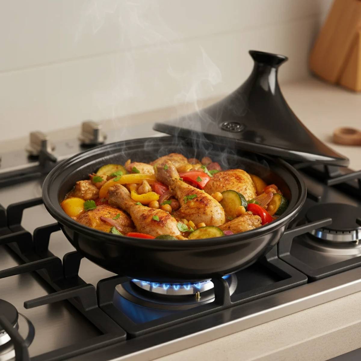 El tajín es sinónimo de encuentros y generosidad. Contrastes variados, de deseos y recuerdos compartidos. Es también una de las pocas recetas que designa tanto un plato… como el plato en el que se cocina. Prueba, por si hiciera falta alguna, de la importancia de estar bien rodeado al prepararlo.