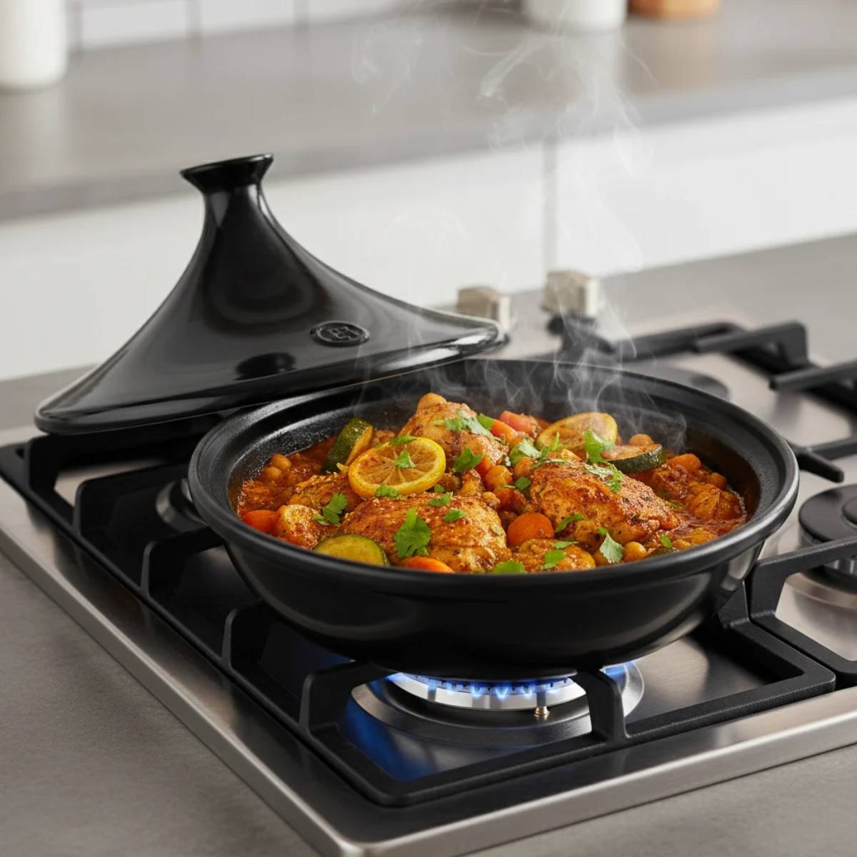 Comience siempre a fuego lento durante los primeros 5 minutos para ir subiendo la temperatura gradualmente. No caliente la base del tagine vacío: añada siempre un poco de agua o aceite. Asegúrese de que siempre haya jugo en el tagine mientras se cocina. Si es necesario, puede añadir un vaso pequeño de agua. Mantenga el tagine cerrado durante la cocción; por supuesto, puede abrirlo rápidamente para añadir otros ingredientes y especias.